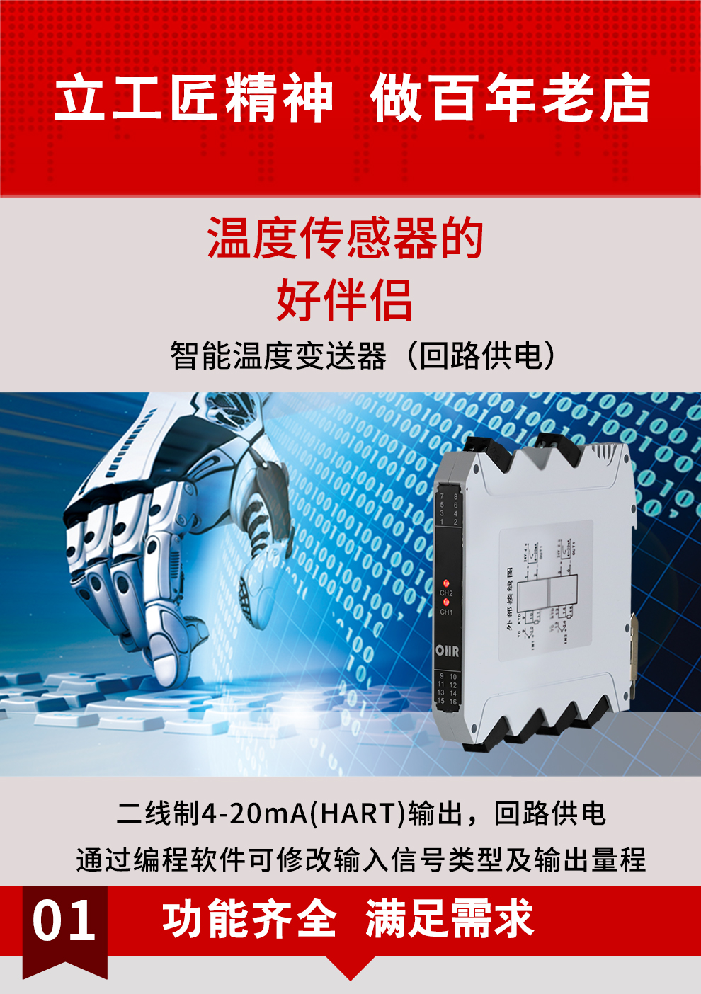 虹潤公司是專業生產溫度變送器的國家專精特新“小巨人”企業。生產的HART智能溫度變送器,具有適配各類溫度傳感器,通過編程線修改輸入信號類型及量程,二線制4-20Ma(HART)輸出,回路供電等特點。該產品不僅通過HART基金會認證、德國萊茵 CE 認證與 SIL 功能安全認證,還獲得具備減震抗干擾能力的溫度變送器、信號隔離器、一種二端子模塊、無源信號隔離器等4項國家發明專利,主持起草物聯網智能溫度儀表、現場設備工具(FDT)接口規范、工業過程測量和控制系統用溫度變送器等3項國家標準,以及通信系統多通道數據采集控制終端規范軍用標準,參與國際5G標準制定,取得HART溫度變送器、智能溫度變送器等5項相關軟件著作權。產品廣泛應用于石油、化工、電力、冶金、制藥、食品、水處理等各種工業領域。